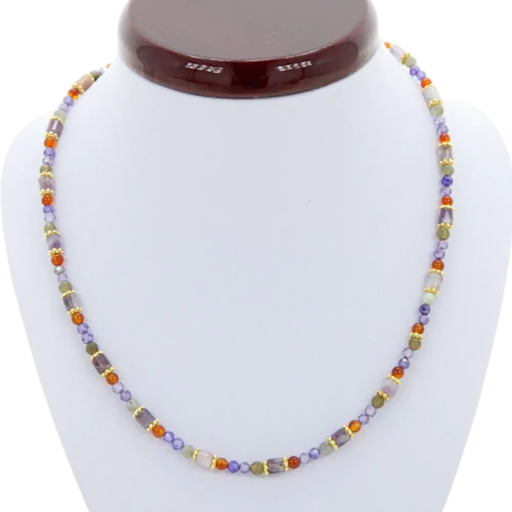 Εξαιρετικά επιτυχημένη αλληλεπίδραση πολύπλευρων πετρών ζιρκονίας (3 χιλιοστά), αγαλματολίτη (4 χιλιοστά), αχάτη (3 χιλιοστά) και επιχρυσωμένων εξαρτημάτων από ανοξείδωτο ατσάλι και χαλκό.